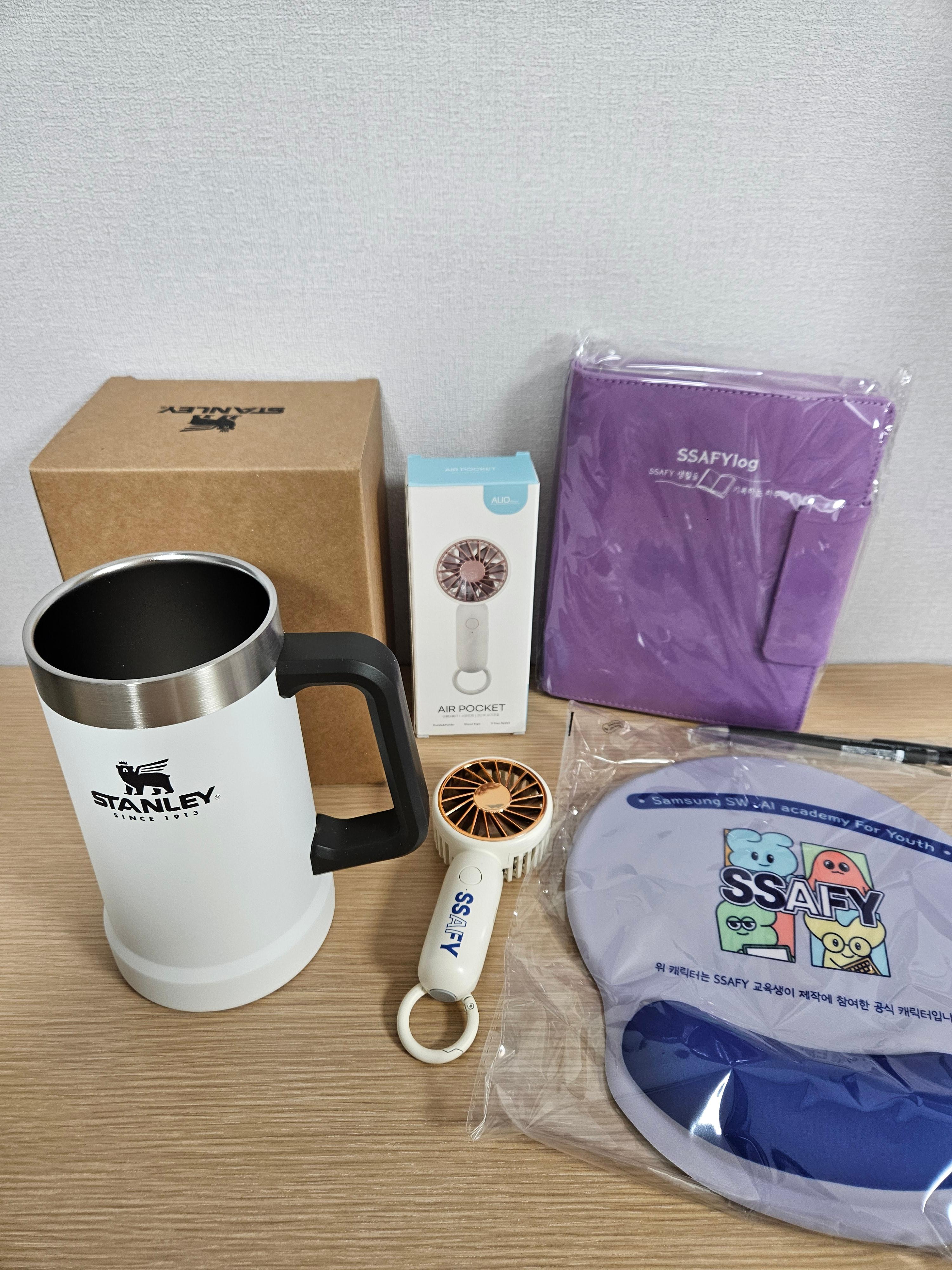 싸피생만이 가질 수 있는 싸피 캐릭터 굿즈, 스탠리 컵, 미니 선풍기, 다이어리, 후드 집업 등